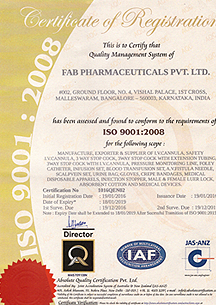 FAB Pharmaceuticals Pvt Ltd.is a Medical Device manufacturer in India since 2012. It has the largest 30000 Sq. feet manufacturing facility with ISO 9001:2008 & ISO 13485:2003 certifications. The products also have CE marking.