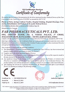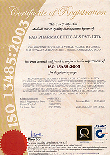 FAB Pharmaceuticals Pvt Ltd.is a Medical Device manufacturer in India since 2012. It has the largest 30000 Sq. feet manufacturing facility with ISO 9001:2008 & ISO 13485:2003 certifications. The products also have CE marking.
